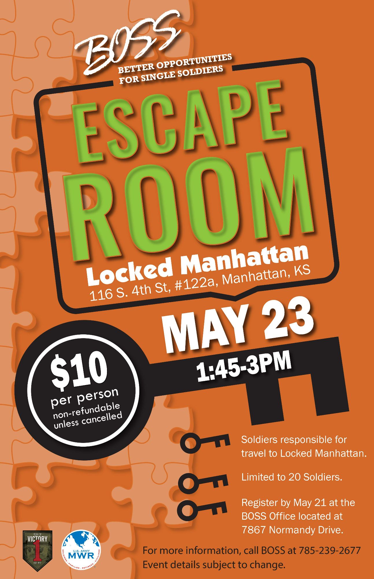 $10 per person (non-refundable unless cancelled) Soldiers responsible for their own transporation.