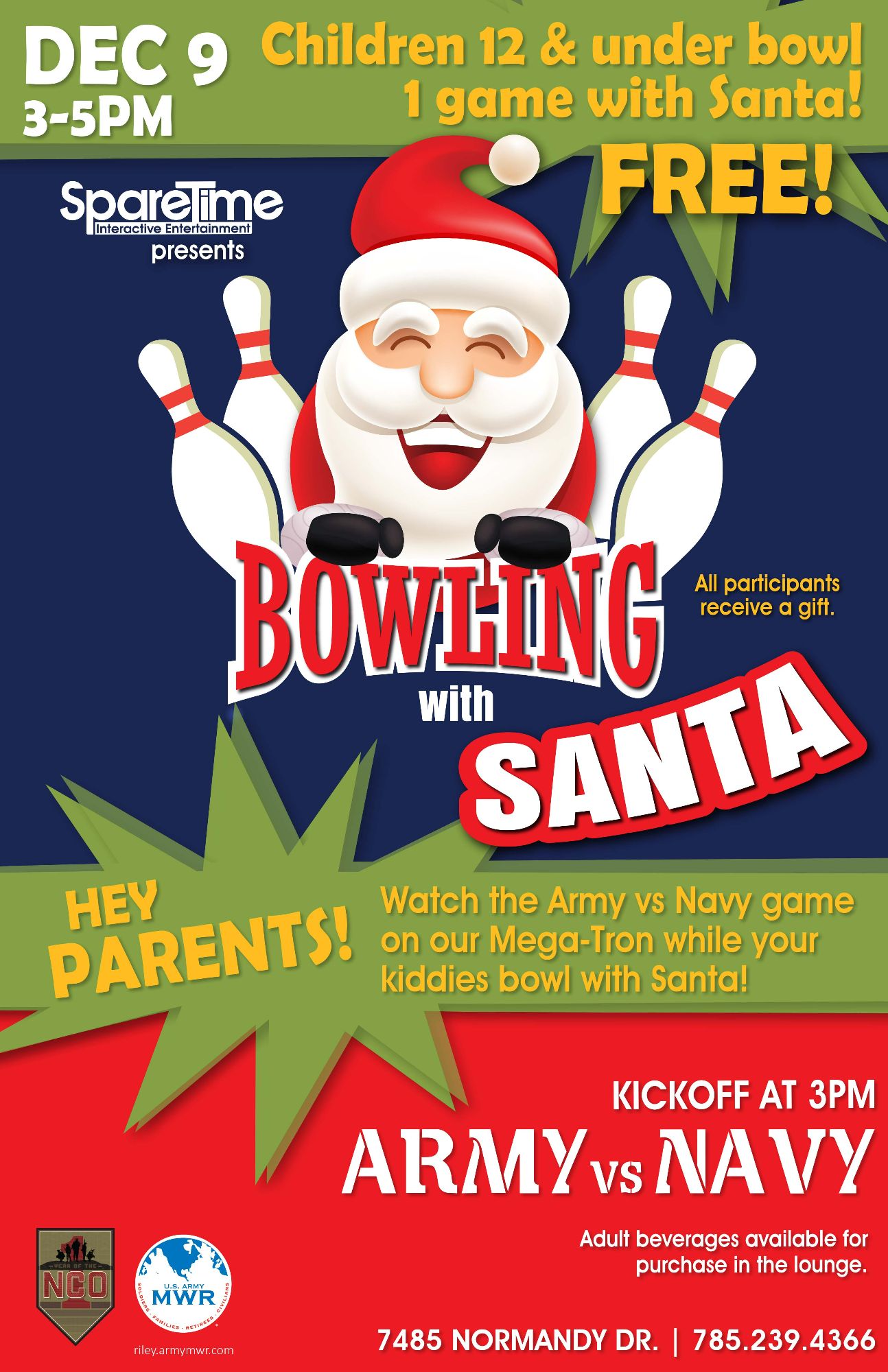 Children 12 & under bowl 1 game FREE with Santa while parents watch the Army Navy Game on the Mega-Tron.
