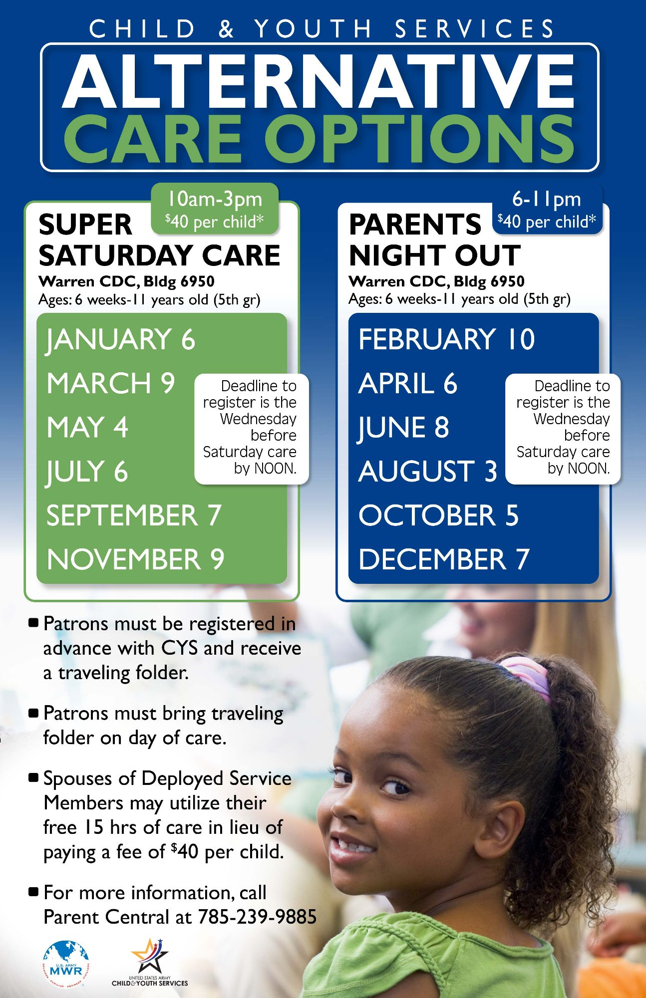 $40 per child. (Spouses of deployed service members may utilize their free 15 hrs. of care in lieu of paying a fee of $40 per child.