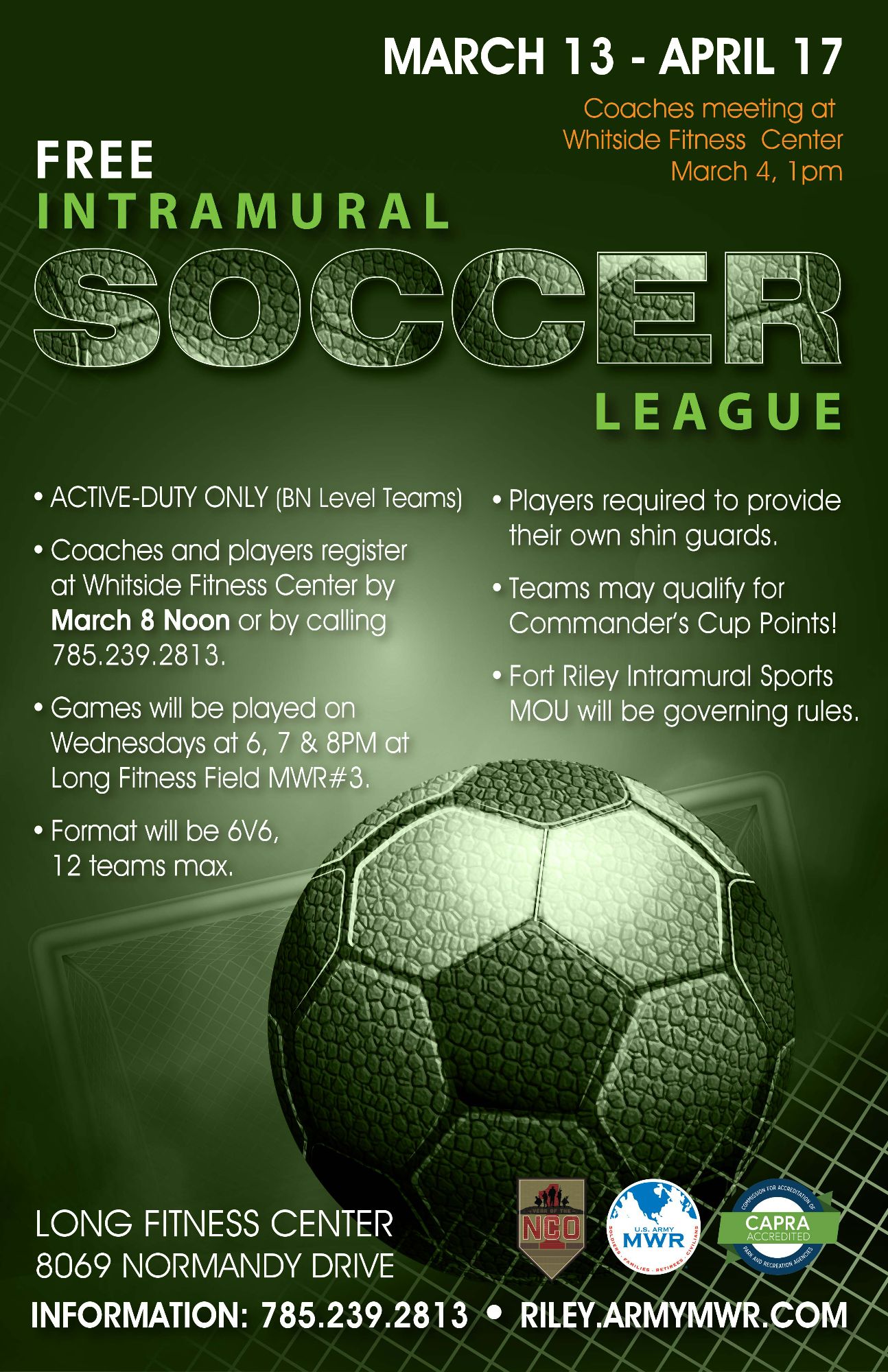 Coaches and players register by March 8, Noon at Whitside Fitness Center or by calling 785.239.2813.