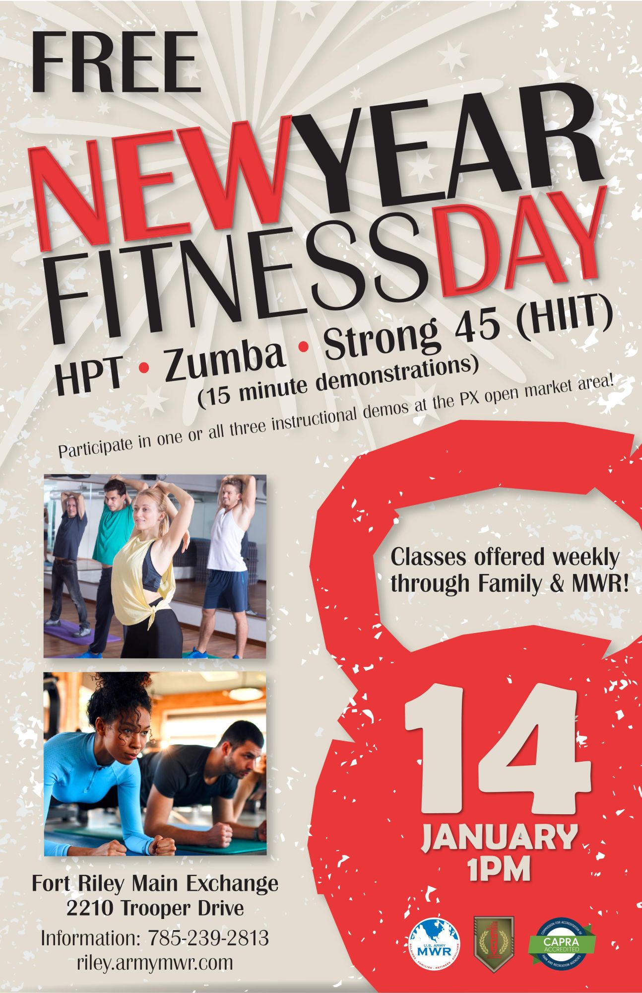 Three 15 minute demonstrations of fitness classes offered by Fort Riley Family and MWR.