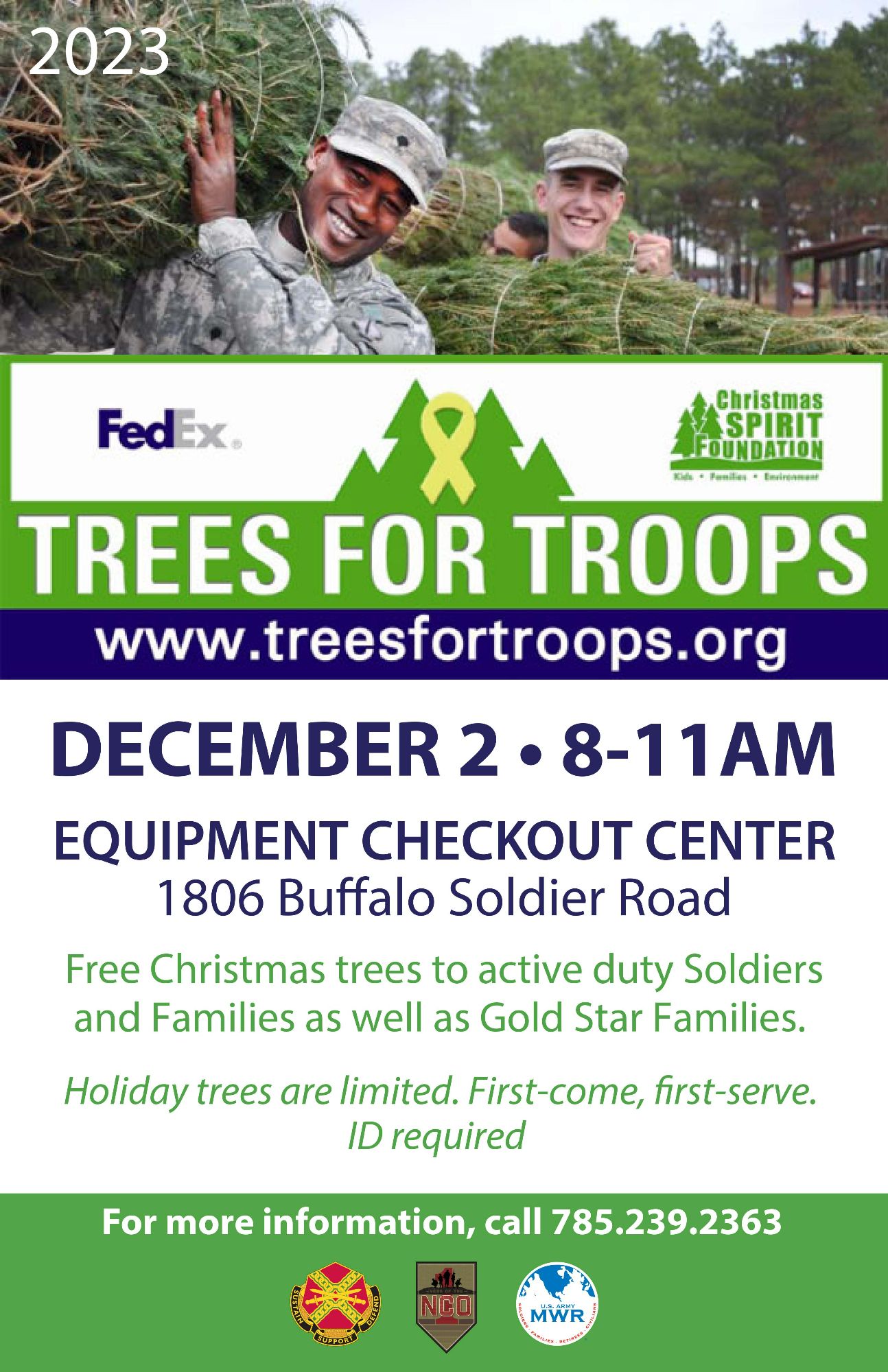 Free Christmas trees to active duty Soldiers and Families as well as Gold Star Families.