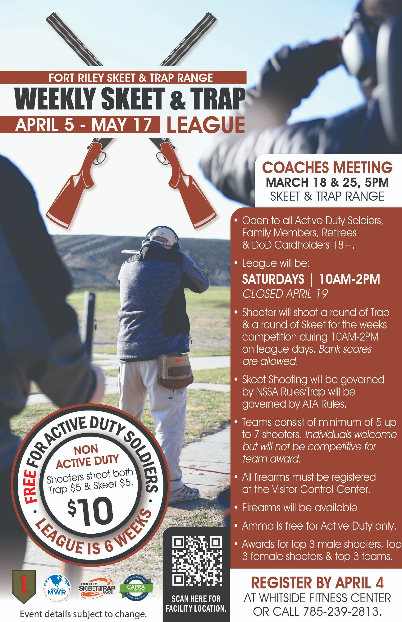 Free for Active Duty | $10 for Non Active Duty (Trap: $5 & Skeet: $5)
