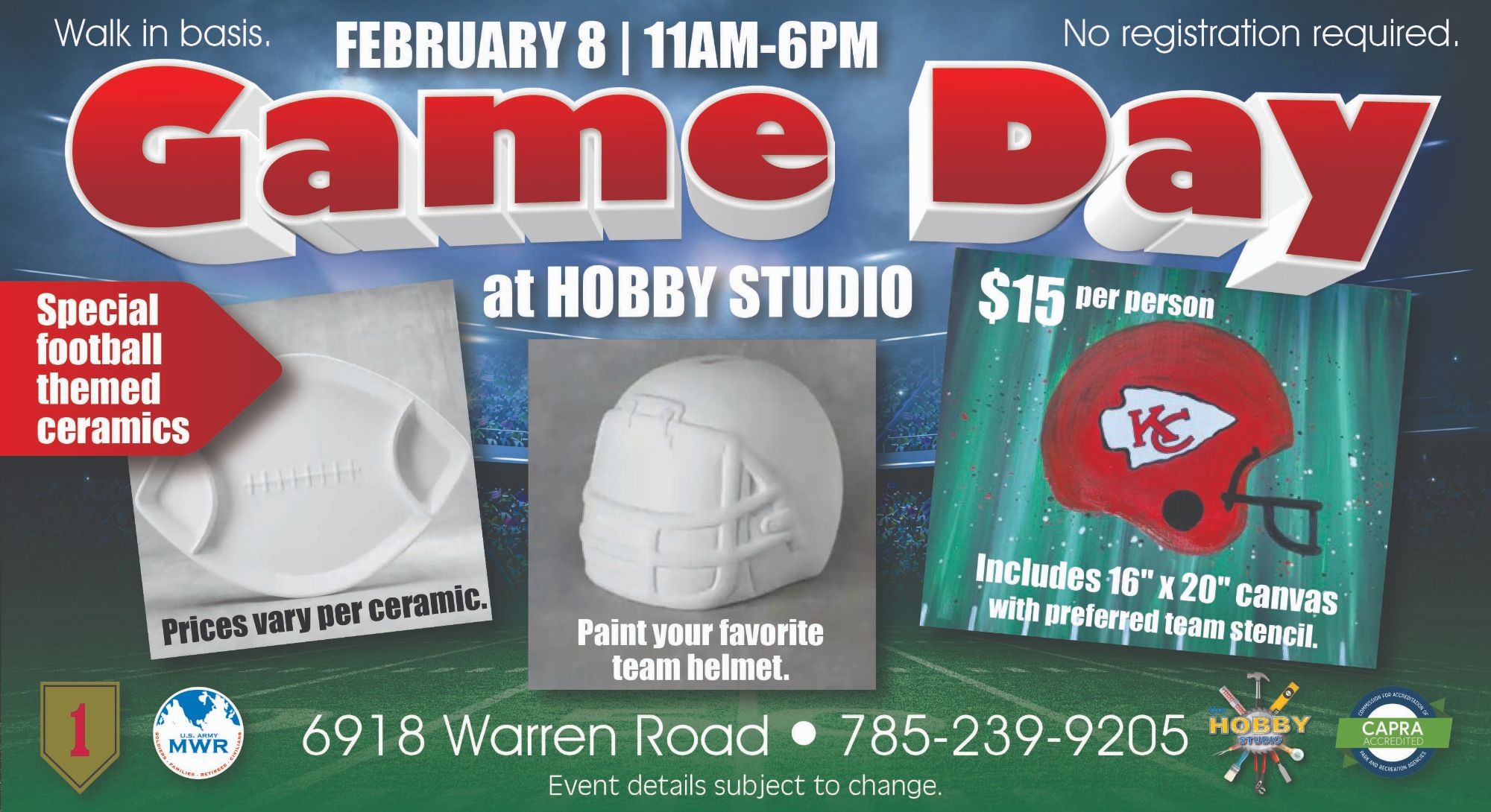 Prices vary per ceramic. $15 per person canvas painting.