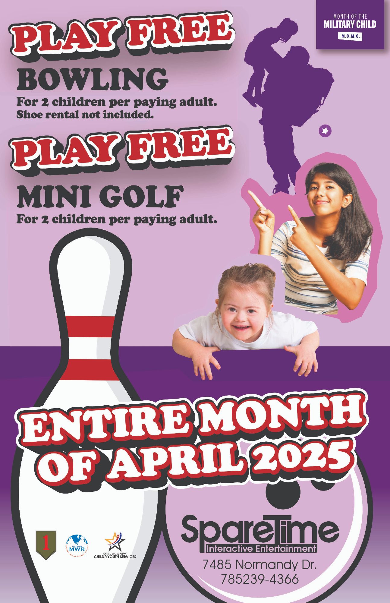 2 children bowl free per paying adult or 2 children play mini golf free per paying adult.
