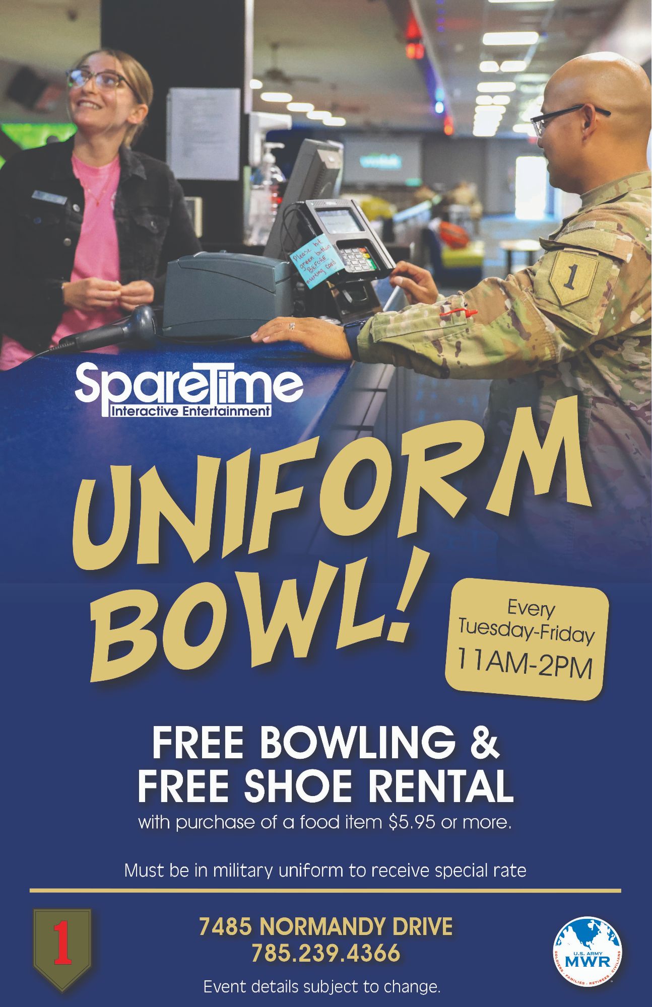 Free Bowling & Free Shoe Rental with purchase of a food item $5.95 or more. Must be in military uniform for special rate.