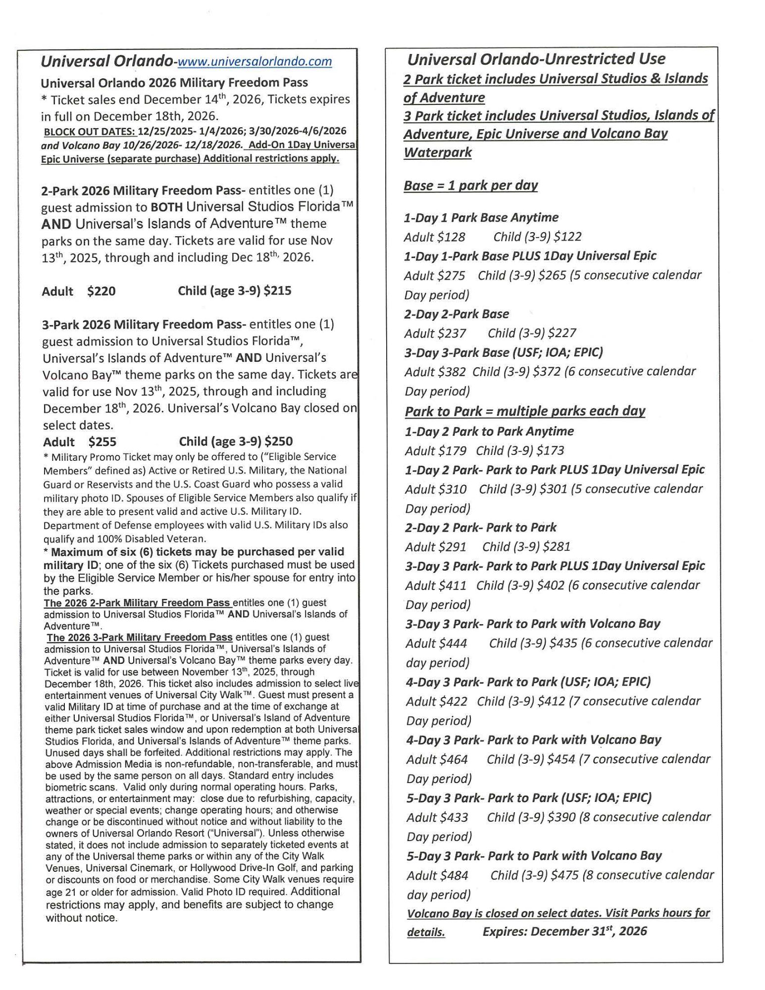 Click here to open the 2025 Disney, and other Florida attractions price list