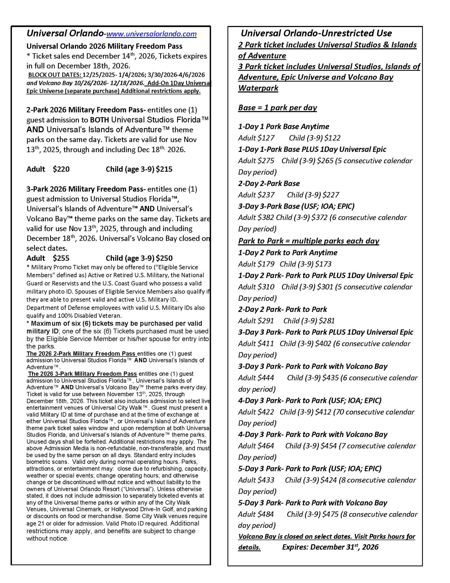 Click here to open the 2026 Disney, and other Florida attractions price list