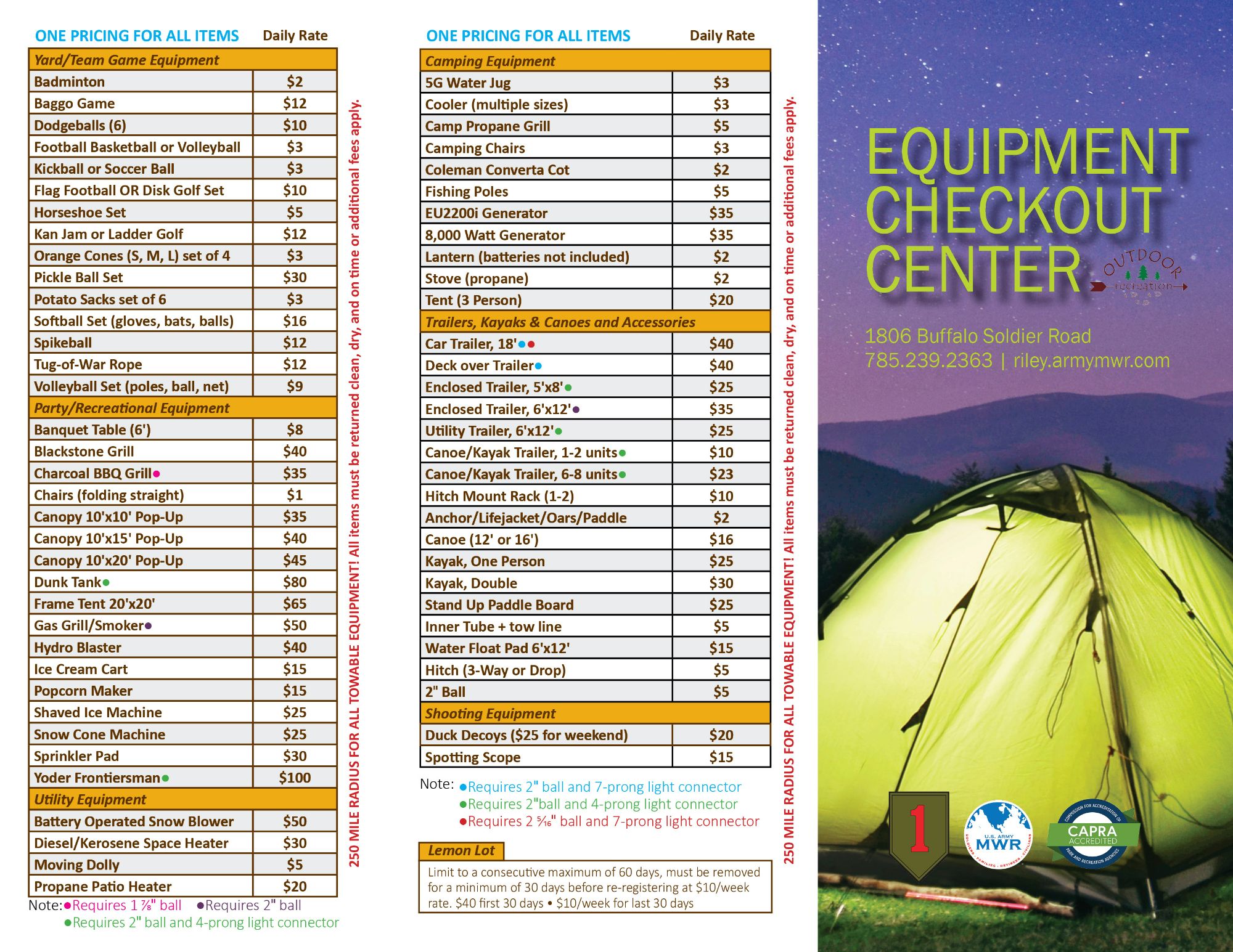 - Items must be reserved in person at the Outdoor Recreation Equipment Check Center. We cannot accept reservations via phone, email or text.