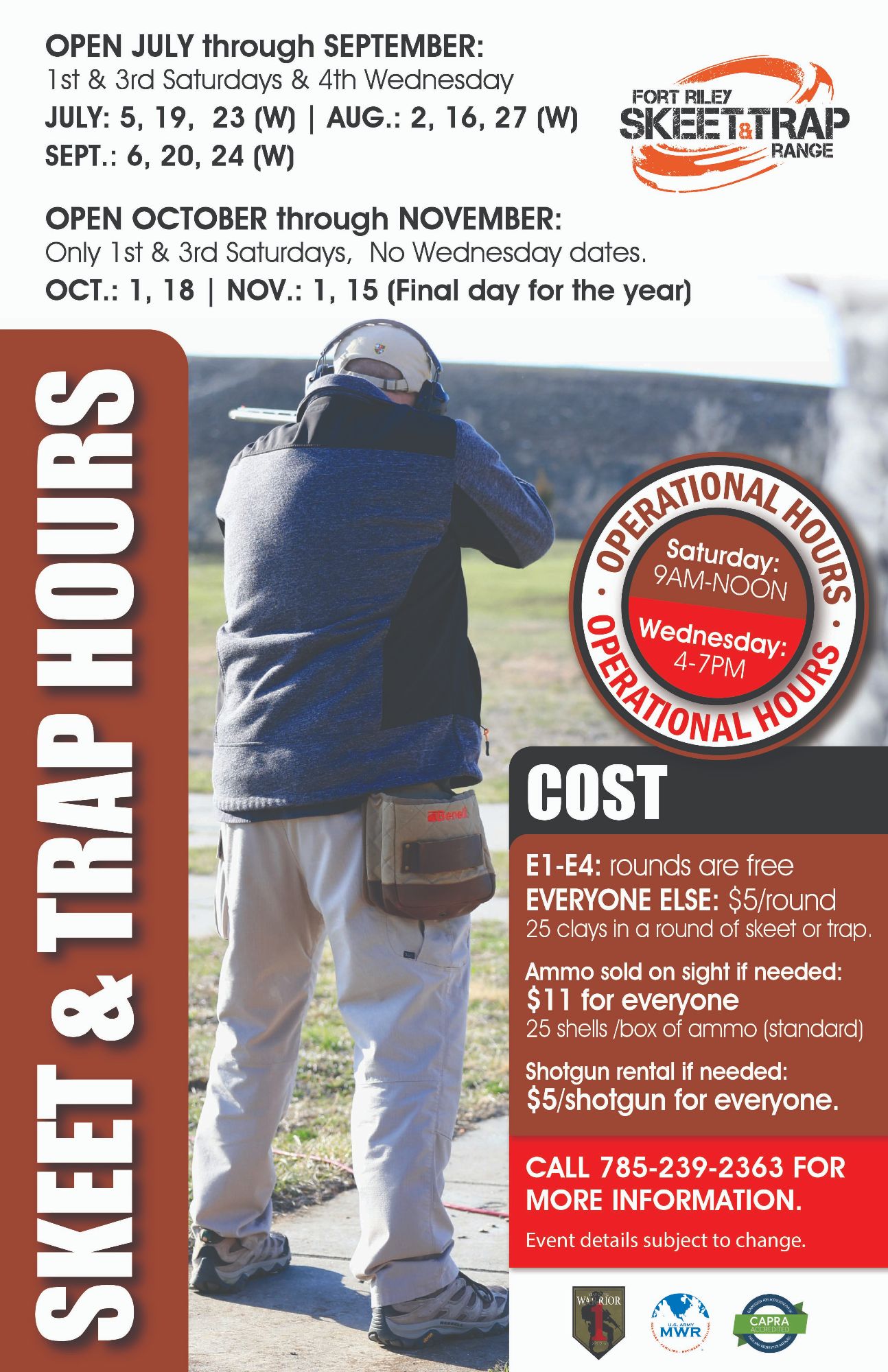 The Fort Riley Skeet and Trap Range is the perfect facility to polish and practice your shooting skills. Bring out your own firearm or use a range gun. Eye and ear protection are available for use. Call or drop by the Outdoor Adventure Travel Center to arrange introductory classes, parties, Warrior Adventure Quest programs and unit functions.
